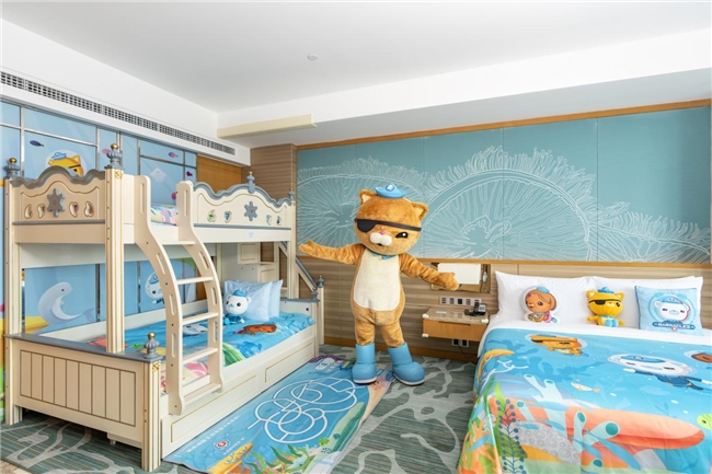 新推出的“海底小纵队主题房”,以热门动画片《海底小纵队》为蓝本,结合动画人物IP形象及海洋元素,设计了多种房型,为亲子家庭打造了一个充满童趣与探险氛围的亲子空间。